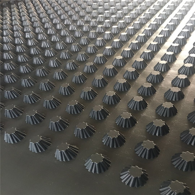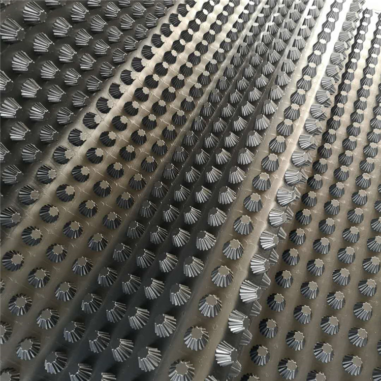 圓錐突臺的頂面膠接一層過濾土工布,以阻止泥土微粒通過,從而避免排水通道阻塞使孔道排水順暢。 傳統(tǒng)的排水方式使用磚石瓦塊作為導(dǎo)濾層、使用較多的鵝卵石或碎石作為濾水層、將水排到指定地點(diǎn)。而用排水板取代鵝卵石濾水層來排水則省時(shí)、省力又節(jié)能、節(jié)省投資、還能降低建筑物的荷載。