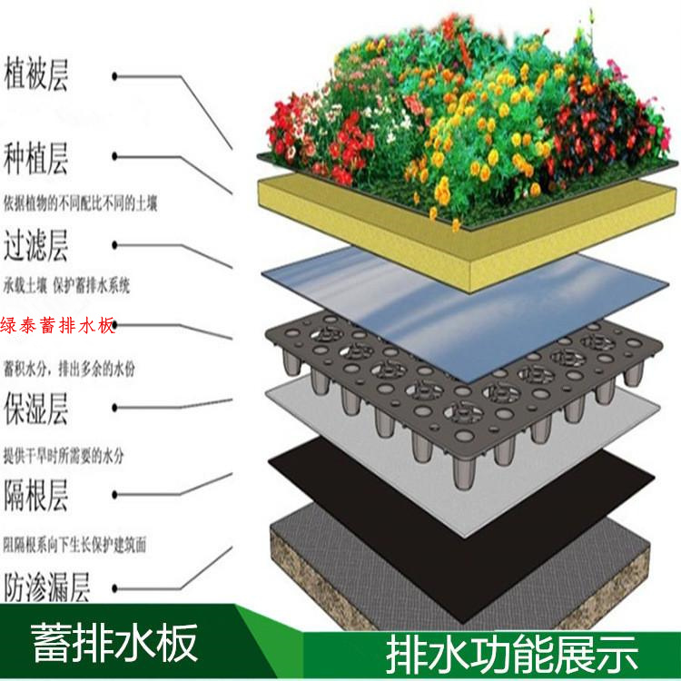 蓄排水板采用聚乙烯或聚丙烯經(jīng)加熱加壓定型形成的一種既能營(yíng)造具有立體空間支撐剛度的排水通道,又可蓄水的一種輕型板材。該種板材自身就具有蓄水、排水兩種綜合功能,板材具有空間剛度極高的特點(diǎn),抗壓性明顯優(yōu)于同類產(chǎn)品(可以通過現(xiàn)場(chǎng)試驗(yàn)檢驗(yàn)),能夠承受400Kpa以上的高抗壓負(fù)荷,同時(shí)可以承受在種植頂板回填土過程中機(jī)械碾壓的極端負(fù)荷情況。