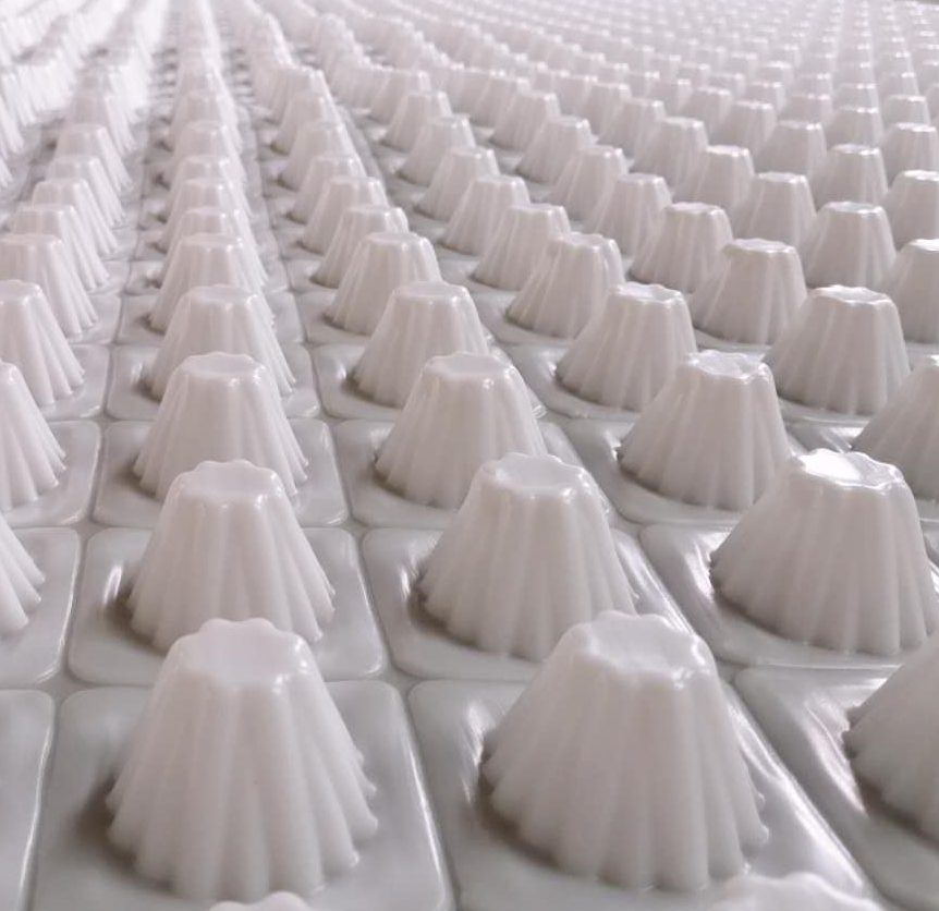 圓錐突臺的頂面膠接一層過濾土工布,以阻止泥土微粒通過,從而避免排水通道阻塞使孔道排水順暢。 傳統(tǒng)的排水方式使用磚石瓦塊作為導(dǎo)濾層、使用較多的鵝卵石或碎石作為濾水層、將水排到指定地點(diǎn)。而用排水板取代鵝卵石濾水層來排水則省時、省力又節(jié)能、節(jié)省投資、還能降低建筑物的荷載。